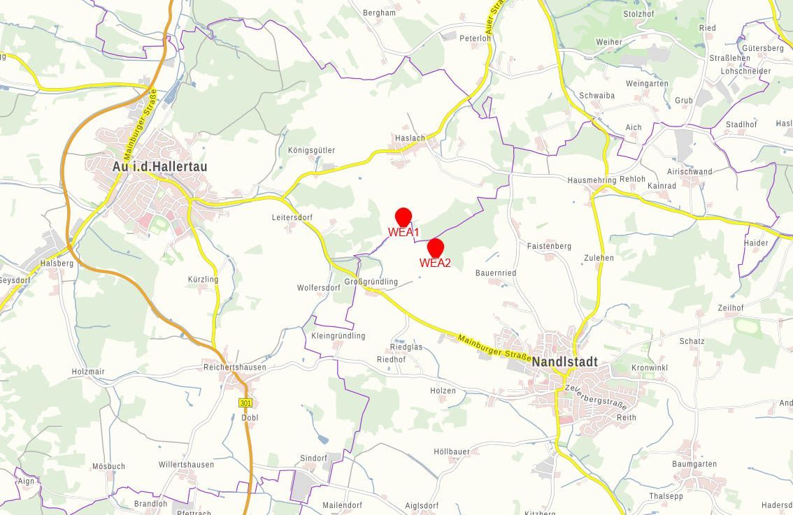 Die geplanten Windkraftanlagen befinden sich zwischen den Orten Au i.d. Hallertau und Nandlstadt. Die Anlagen sind BImSCH genehmigt und haben bereits den EEG-Zuschlag erhalten. Der Netzanschluß befindet sich direkt an den Anlagen.